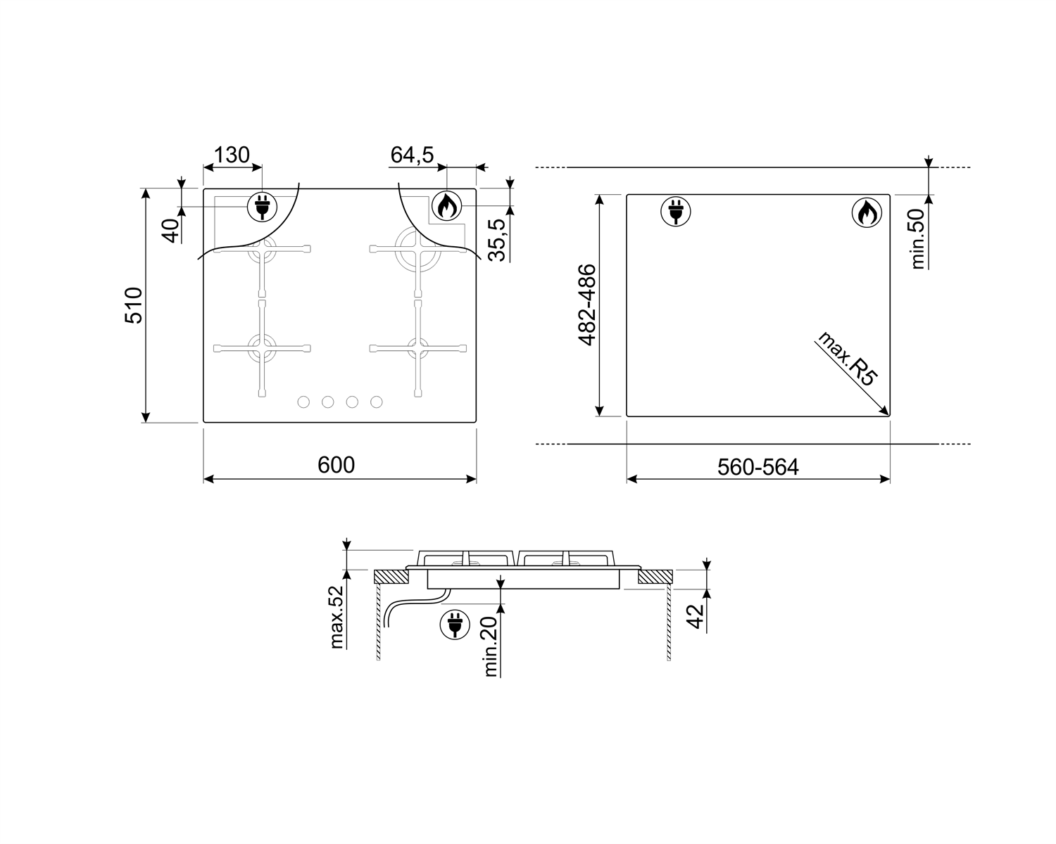 Газовая варочная панель, 60 см, чёрное стекло, прямой край.