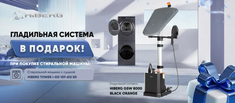 При покупке стиральной машины с сушкой HIBERG TOWER i-DD 107-612 Sd - Паровая гладильная система HIBERG GSW 8000 BLACK ORANGE в подарок!